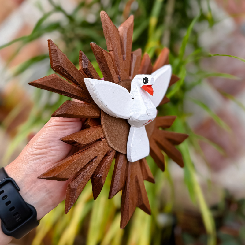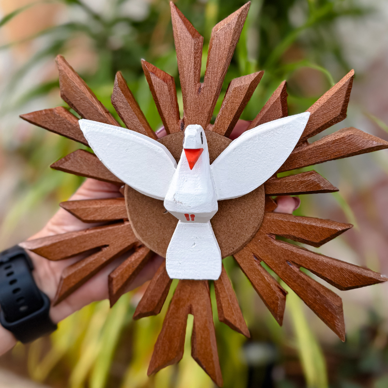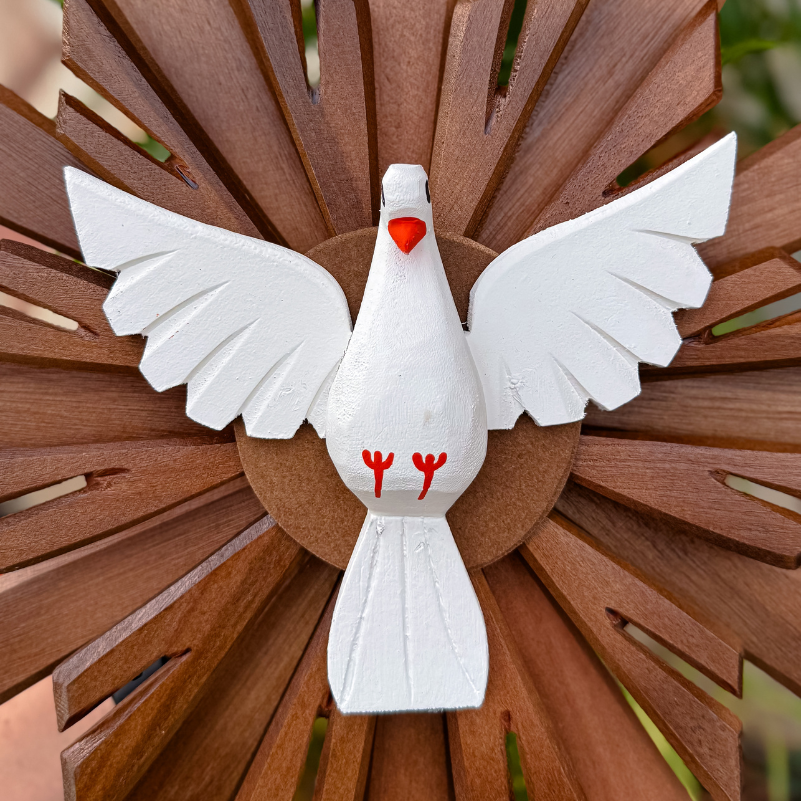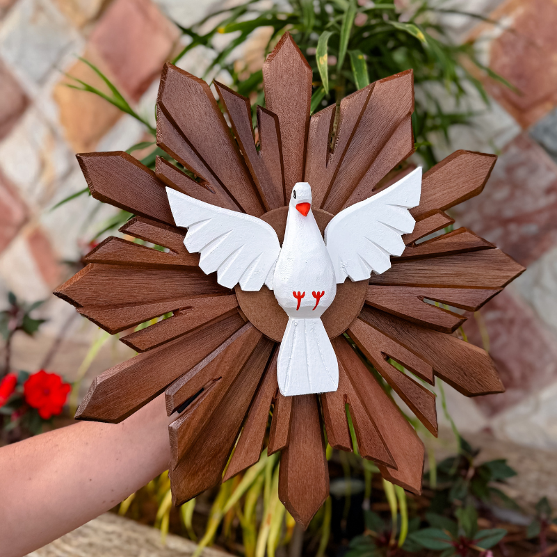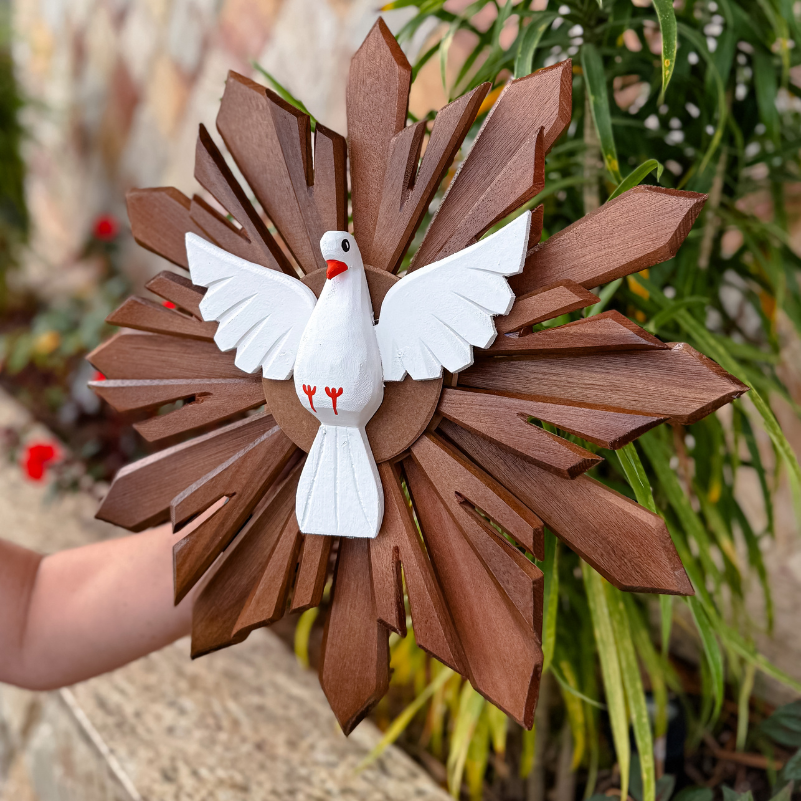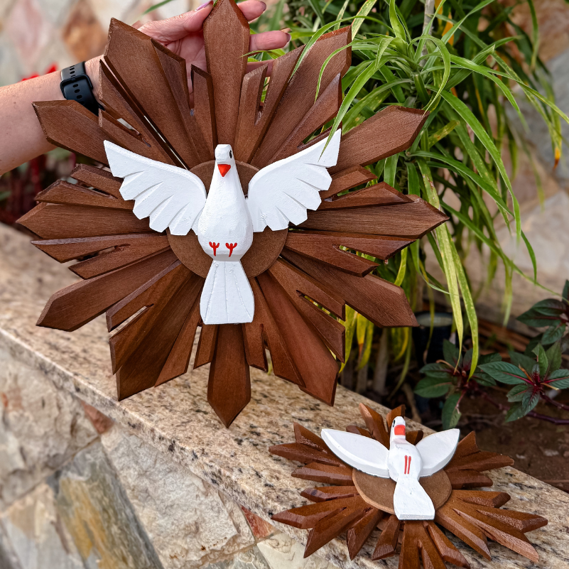 Feito à mão com devoção e cuidado, o Divino Resplendor é uma peça artesanal esculpida em madeira, que carrega a força simbólica do Espírito Santo e o brilho da fé popular brasileira. Produzido diretamente na capital nacional do artesanato têxtil, este item une tradição, arte e espiritualidade em um único objeto.